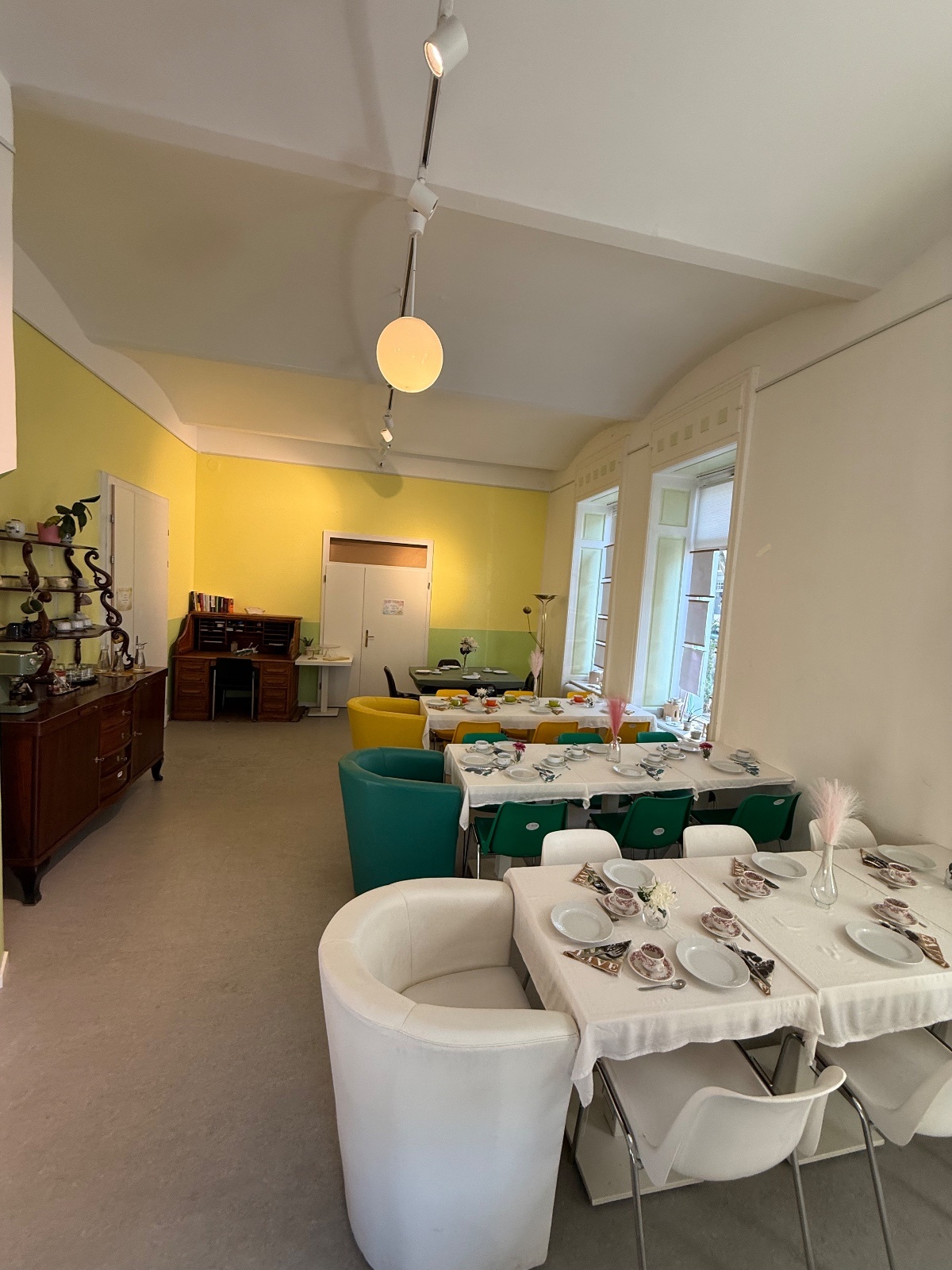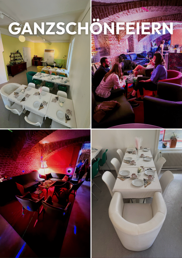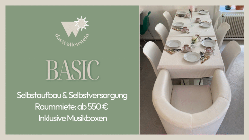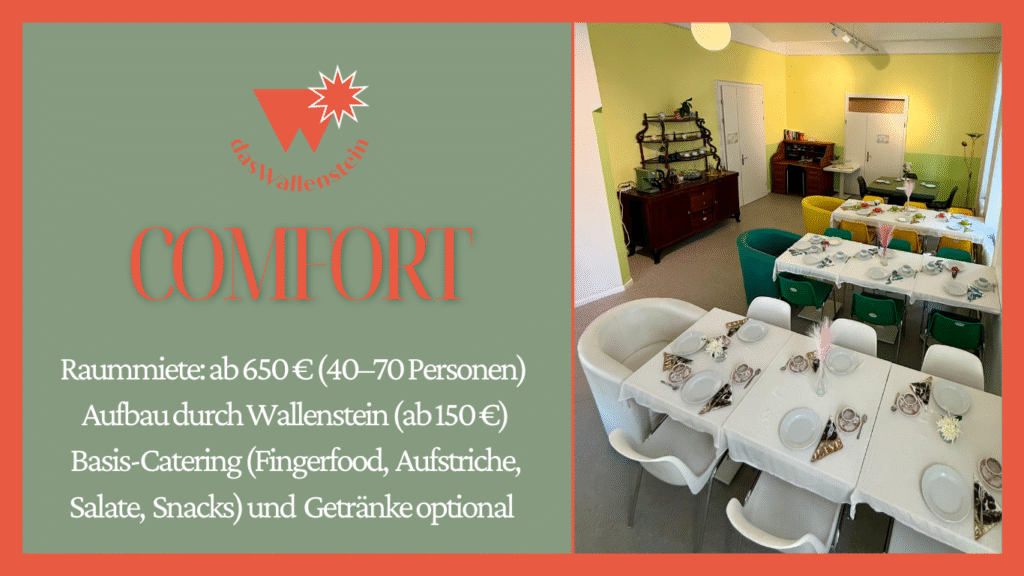 Deine Wahl: Miete die Räume als Selbstversorger und nutze unser gesamtes Equipment, während du Speisen und Kuchenbuffet selbst mitbringst – oder entscheide dich für unser professionelles Catering-Angebot mit Buffet & Getränken.